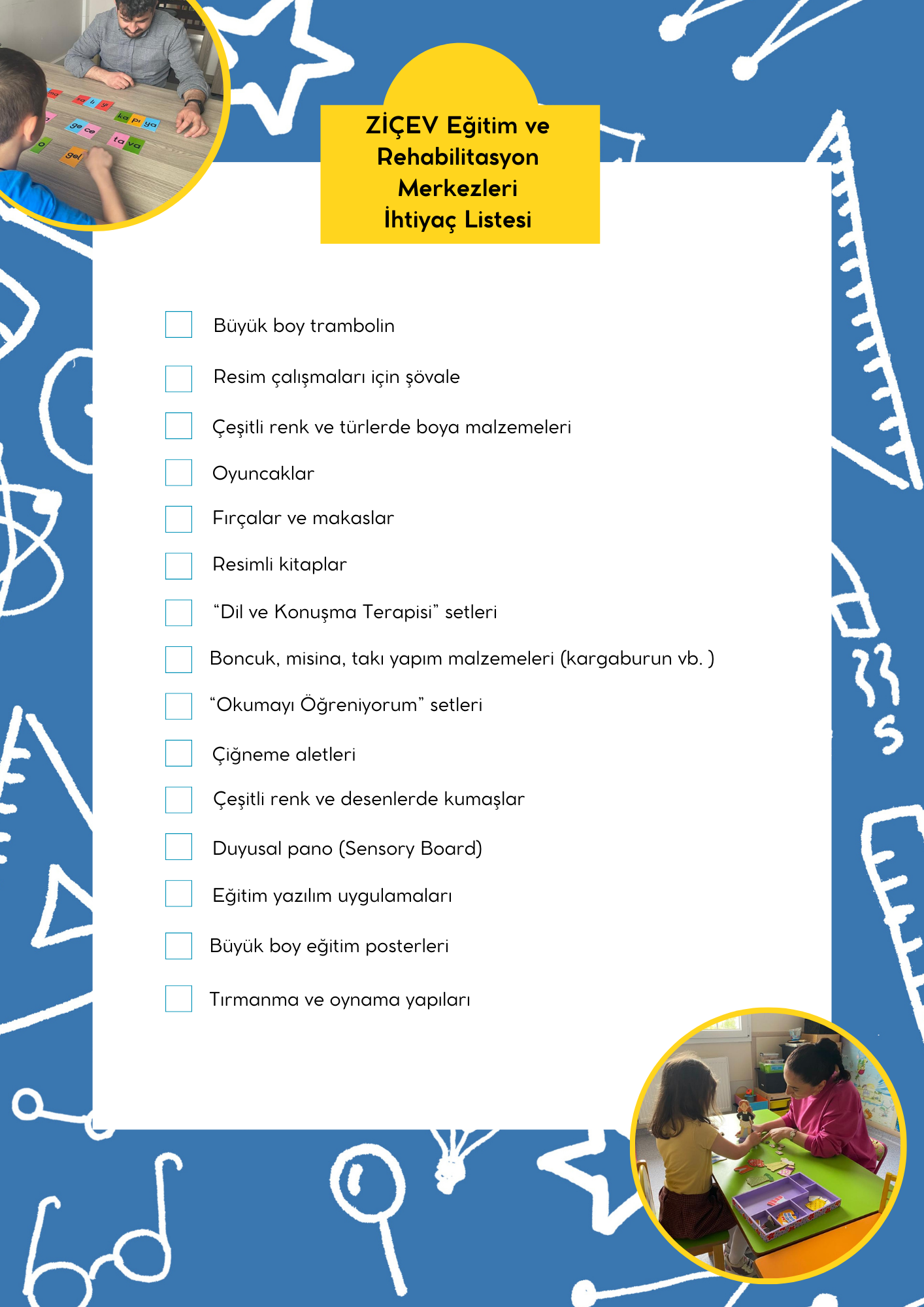 Bu sayfada bulunan ihtiyaç listeleri ZİÇEV’in Türkiye genelinde bulunan 13 Rehabilitasyon Merkezi, 1 Kreş ve Gündüz Bakımevi, 1 Yatılı Bakım Merkezi ve 3 Soluk Alma Evi’nde eğitim alan özel gereksinimli bireylerin ihtiyaçları doğrultusunda hazırlanmıştır.